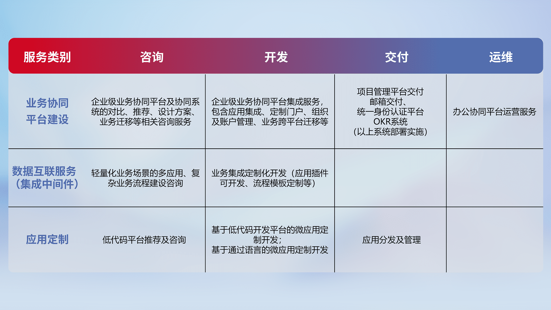 针对钉钉、、企微、、、IDaas等平台级产品提供产品的规划、、、方案、、交付、、、定制化开发等服务,,,,实现如统一协同办公、、、智能客户服务、、混合会议管理、、、智能数据查询、、、、等业务场景,,,实现数字化转型。。